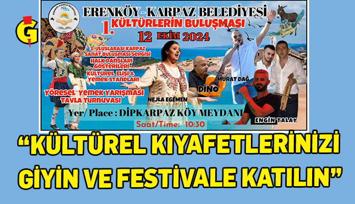 Erenköy-Karpaz Belediyesi’nin organize ettiği 1. Kültürlerin Buluşması Festivali cumartesi Dipkarpaz köy meydanında gerçekleştirilecek. Festival, “Kültürel kıyafetlerinizi giyin ve festivale katılın” temasıyla yapılıyor.