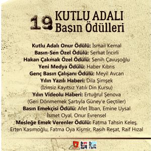 Lefkoşa Büyük Han’da 6 Temmuz Pazartesi saat 20.30’da düzenlenecek törenle 19’uncu Kutlu Adalı Basın Ödülleri sahiplerine verilecek.