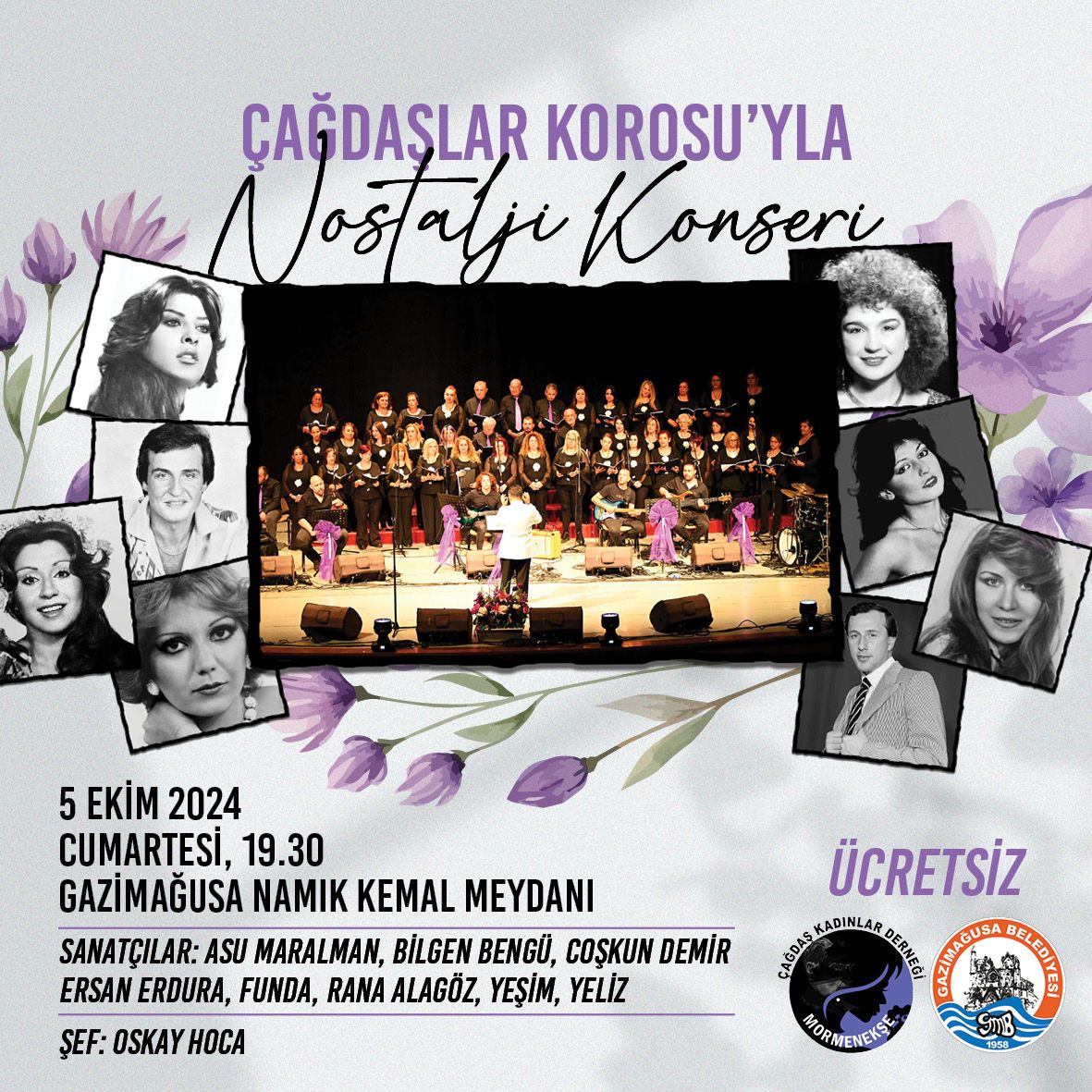 Şef Oskay Hoca yönetimindeki Çağdaşlar Korosu’nun eşlik edeceği gecede, Asu Maralman, Bilgen Bengü, Coşkun Demir, Ersan Erdura, Funda, Rana Alagöz, Yeşim ve Yeliz sahne alacak.