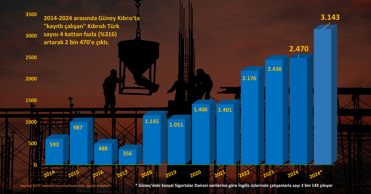 Güney Kıbrıs’ta ekmek kavgası veren Kıbrıslı Türk sayısı her geçen gün artarken, ekonomiye taşıdıkları taze nakit para da ciddi miktarlarda yükseliyor. İstatistik Kurumu’nun 8 aylık gecikmeyle açıkladığı Hanehalkı İşgücü Anketi 2024 sonuçlarına göre Güney’de 2 bin 470 kişi çalışıyor. Güney’deki Sosyal Sigortalar Dairesi’nin istatistikleri ise kayıtlı çalışanların sayısını 3 bin 140 kişi düzeyinde gösteriyor. Geçen yıla ait olan bu veriye göre İngiliz Üsleri de sahil olmak üzere 3 bin 057 kişi özel veya yarı özel sektörlerde; 21 kişi de kamuda maaşlı çalışıyor. Ayrıca, 20 kişinin ise kendi istekleriyle sigortalı oldukları, “diğerleriyle” birlikte sigortalı Kıbrıslı Türklerin toplam sayısının ise 3 bin 143 çıktığı belirtiliyor. Kıbrıslı Türklerin Güney’de tüm çalışanlar içindeki payı %0.55 düzeyinde iken, Kuzey’deki toplam istihdamdaki payı %1.8’e yükseldi.