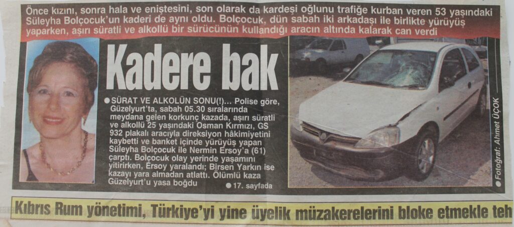 40 yıldır her sabah yürüyüş yapan Birsen Yarkın, 3 arkadaşıyla böyle bir yürüyüşteyken kaza geçirdi. Girne’den gelen alkollü sürücü direksiyon hakimiyetini kaybederek, yayaların olduğu tarafa geçti.
