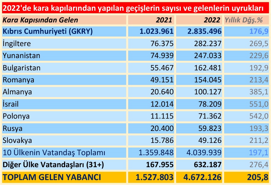 2022 yılında kara kapılarını kullanarak Kuzey Kıbrıs’a geçen Kıbrıslı Rum sayısı tüm zamanların en yüksek noktasına ulaşarak rekor kırdı. Türk Lirası’nın Euro karşısında aşırı değer kaybı nedeniyle Güney’in “ucuzluk merkezine” dönüşen Kuzey’e akın akın gelen Kıbrıslı Rumların sayısı 2021’e göre %177 oranında arttı. Kıbrıslı Rumlar; 2021’deki 1 milyon 023 bin 961 geçişten, 2 milyon 835 bin 496 geçiş sayısına uçtu. Açıklanan resmi rakamlara göre; Güney’e geçen Kıbrıslı Türk sayısı da aynı sürede %109 artışla 915 bin 156’dan 1 milyon 911 bin 837 geçişe çıktı. Ancak bu sayı, açık arayla (923 bin 659 geçiş) Kıbrıslı Rumların gerisinde kaldı.