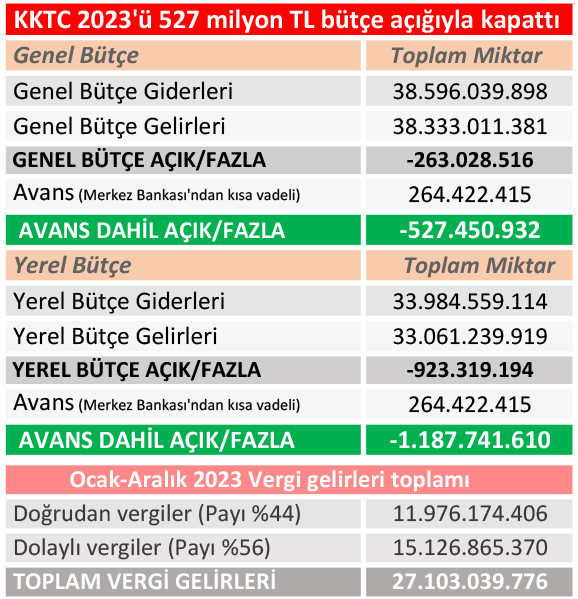 KKTC’nin yerel bütçesi 2023 yılı sonunda 1,1 milyar; genel bütçesi de 527,4 milyon TL’den fazla açık verdi