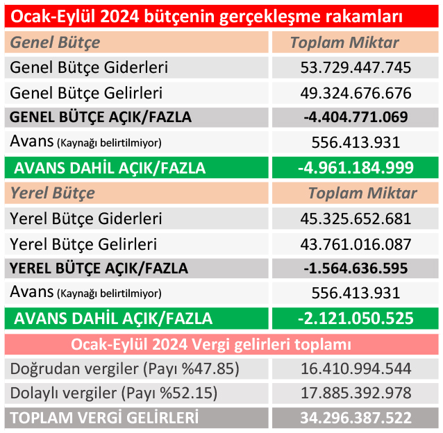 KKTC Maliyesi’nin Ocak-Eylül 2024 döneminde “avans dahil” toplam yerel bütçe açığı 2 milyar 121 milyon TL düzeyinde; genel bütçe açığı ise 4 milyar 961 milyon TL düzeyinde açıklandı. Maliye Bakanlığı’nın verileri, Eylül sonu itibarıyla “genel bütçedeki” açığın 4 milyar 404 milyon; “yerel bütçedeki” açığın ise 1 milyar 564 milyon TL’nin üzerine çıktığına işaret ediyor. Ancak, buna kaynağı belirtilmeyen “556 milyon TL” tutarındaki avans eklenince, açık rakamları daha da derinleşiyor.