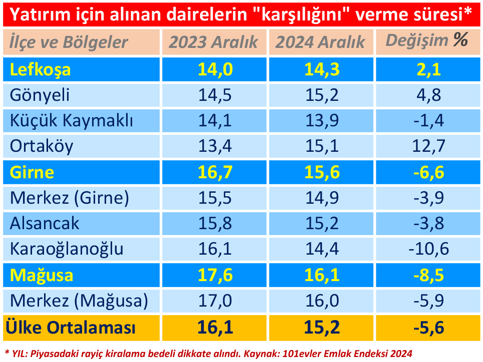 KKTC’de yatırım olarak alınan ve kiralanan bir apartman dairesinin yatırım karşılığını verme süresi (geri dönüş süresi) 2024 yılında 15.2 yıla kadar indi. Bu süre, 2023’te 16.1 yıl, 2022’de de 15.8 yıl idi. 101 Evler emlak sitesinin verilerine göre, apartman dairelerinin geri dönüş süresi en kısa olan ilçe ortalama 14.3 yılla Lefkoşa olurken, 2023 yılına göre (14) 3 aylık artış dikkati çekti. Girne ve Mağusa’da ise sert düşüşler söz konusu. Girne’de geri dönüş süresi 13 aylık düşüşle 16.7 yıldan, 15.6 yıla; Mağusa ise 18 aylık düşüşle 17.6 yıldan 16.1 yıla kadar indi.