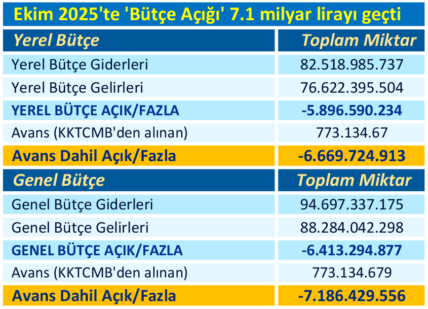 KKTC Maliye Bakanlığı’nın verilerine göre Ekim 2025 sonu itibarıyla 10 aylık genel bütçe 7 milyar 186 milyon 429 bin lira “açık” verdi. Aynı sürede yerel bütçedeki açık 6 milyar 669 milyon 724 bin lira olarak açıklandı. KKTC Maliye Bakanlığı’nın verilerine göre geçtiğimiz Eylül ayı sonu itibarıyla 9 aylık genel bütçe açığı 6 milyar 352 milyon lira; yerel bütçedeki açık da 5 milyar 939 milyon lira olmuştu. Ekim ayı sonunda saptanan “genel bütçe açığının” geçen yılın aynı ayına kıyasla %27 oranında (1 milyar 508 milyon), “yerel bütçe açığının” ise %178 oranında (4 milyar 267 milyon) arttığı dikkati çekti.