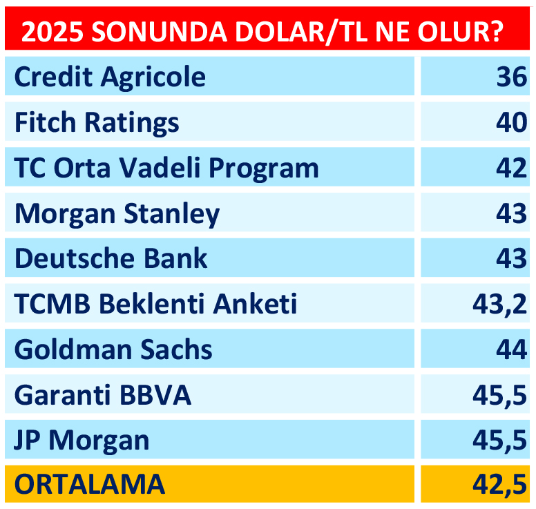 Türk Lirası’nın 2025 yılı içerisinde nasıl hareket edeceği en çok merak edilen konuların başında geliyor. İşçi veya iş insanı, bankacı veya bürokrat, esnaf veya memur, ev hanımı veya öğrenci hemen herkes TL’nin iniş ve çıkışları ile enflasyonun geldiği noktayla çok ilgili. Bu durum da TL’ye yönelik öngörüleri önemli hale getiriyor. Uluslararası piyasalarda ve Türkiye’de 2025’in dolar/TL tahminleri genelde yükseliş içeriyor. Gerek Türkiye içinde gerekse dış piyasalarda yıl sonundaki dolar/TL kuru öngörüleri 36 ile 45 TL arasında değişiyor.
