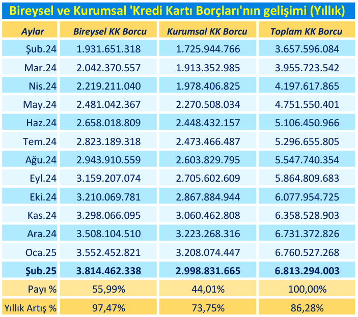 KKTC Merkez Bankası, verilerine göre Şubat 2025’te “bireysel” (vatandaşın) kredi kartı borçları 3 milyar 815 milyon TL düzeyine, “kurumsal” kredi kartı borçları da 2 milyar 998 milyon TL düzeyine yükseldi. Toplam kredi kartı borçları içinde %56’lık paya sahip olan bireysel borçların bir yıllık sürede %97.47 oranındaki artışı büyük dikkat çekti. Geçen yıl bireysel borçlar 1,9 milyar lira; %74 oranında artan kurumsal borçlar da 1,7 milyar lira civarındaydı.