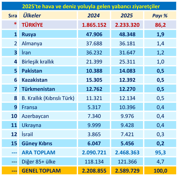 KKTC’ye 2025 yılında hava ve deniz limanlarını kullanarak gelen “yabancı” yolcu sayısı 380 bin 874 kişi (%17.24) artarak, 2 milyon 589 bin 729 kişiye çıktı. 2024 yılında gelen yabancı sayısı 2 milyon 208 bin 855 kişi; 2023 yılında da 1 milyon 854 bin 490 kişi olarak açıklanmıştı. Bu rakamlara KKTC uyruklu 399 bin 343 kişi de katılınca, havadan ve denizden gelenlerin sayısı 2 milyon 989 bin 072 kişiye ulaşıyor. Limanlardan gelen tüm yolcuların 2 milyon 831 bini (%95) Ercan Havalimanı’ndan giriş yaptı. Diğer yolcuların 130 bin 570’i Girne Turizm Limanı’ndan, 26 bin 941’i Mağusa Limanı’ndan, 445’i de Karpaz Yat Limanı’ndan ülkeye giriş yaptı.