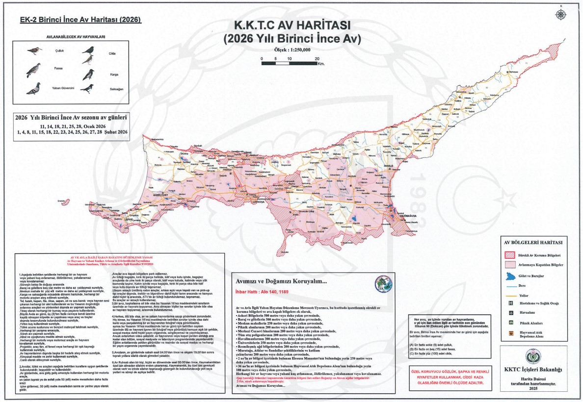 Birinci İnce Av Günleri: 1l-14-18-21-25-28 Ocak 2026 ile l-4-8-l 1-15-18-22-23-24-25-26-27-28 Şubat 2026 günlerinde yapılacak.