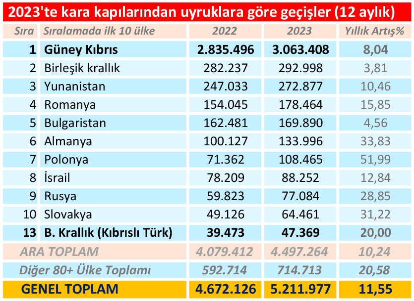 2023 yılında kara kapılarını kullanarak Kuzey Kıbrıs’a geçiş yapan “yabancıların” sayısı bir önceki yılın aynı dönemine göre %11.55 oranında artarak, 4 milyon 672 bin 126 kişiden, 5 milyon 211 bin 977 kişiye çıktı. GIYNIK Gazetesi’nin derlediği rakamlara göre, girişlere yaklaşık 2,5 milyon KKTC uyruklu da dâhil edilince “kapılardan giriş yapanların” sayısı 7 milyon 697 bin 547’ye ulaşıyor. Geçişlerde Rumların ardından İngilizler ikinci sırada, Yunanlar üçüncü sırada yer aldı. 2023’te Kıbrıslı Rumlar ile yabancıların toplam girişleri ilk kez 5 milyonu; Kıbrıslı Türklerle beraber tüm girişlerin sayısı da ilk kez 7 milyonu aştı. Rakamlar ayrıca, 2023’te günde 21 bin 089 girişe işaret ediyor.
