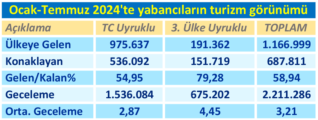 7 aylık dönemde ülkeye gelen 1 milyon 167 bin yabancının 688 bini turistik tesislerde konakladı