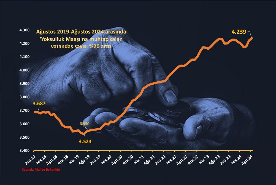 KKTC Maliye Bakanlığı verileri, Aralık 2017 ile Ağustos 2024 arasındaki dönemde “Muhtaç ve Yoksulluk” maaşı ödenen kişi sayısının 3 bin 687 kişiden 4 bin 239’a uçtuğunu gösteriyor. Veriler 82 aylık dönemde maaş bağlanan yoksul sayısında %15’lik artışa işaret ediyor. Ancak, Haziran 2019’da 3 bin 524 kişi ile yaklaşık son 6 yılın en düşük rakamı dikkate alındığında, o tarihten Ağustos 2024’e kadarki sürede yoksul maaşı bağlanan kişi sayısının %20.3 oranında arttığı görülüyor.