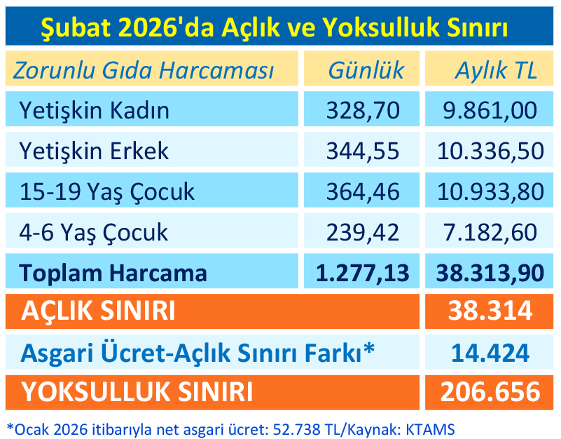 KTAMS’a göre 4 kişilik bir aile sadece sağlıklı beslenebilmek için günde en az bin 227 (1.227) lira harcama yapmak zorunda. Verilere göre yetişkin bir kadının yapması gereken zorunlu gıda harcaması tutarı günlük 329, aylık 9 bin 861 TL; yetişkin bir erkek için günlük 345, aylık 10 bin 337 TL; 15-19 yaş çocuk için günlük 365, aylık 10 bin 934 TL; 4-6 yaş çocuk için günlük 239, aylık 7 bin 183 TL olarak hesaplandı. Kıbrıs İşçi ve Emekçi Sendikaları Federasyonu (KİEF) ve KTAMS Başkanı Güven Bengihan, açlık ve yoksulluk sınırına değindiği açıklamasında, “asgari ücretli hanelerin hükümet tarafından yoksulluğa terk edildiğini” savundu.