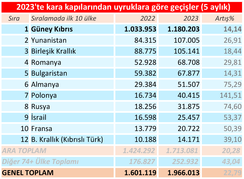 Kuzey Kıbrıs ile Güney Kıbrıs’ı bağlayan kara kapıları oldukça yoğun. Ocak-Mayıs 2023 döneminde kara kapılarını kullanarak Kuzey Kıbrıs’a geçiş yapan “yabancıların” sayısı bir önceki yılın aynı dönemine göre %22.79 oranında artarak, 1 milyon 601 bin 119 kişiden, 1 milyon 966 bin 013 kişiye çıktı. GIYNIK Gazetesi’nin derlediği rakamlara KKTC uyruklular (982 bin 053 giriş) da dâhil edilince “kapılardan kuzeye geçiş yapanların” sayısı 2 milyon 945 bin 264’e ulaşıyor. Geçişlerde Kıbrıslı Rumlar’ın ardından Yunanistan vatandaşları ikinci sırada, Birleşik Krallık (İngiltere) vatandaşları da üçüncü sırada kalmayı sürdürdü.