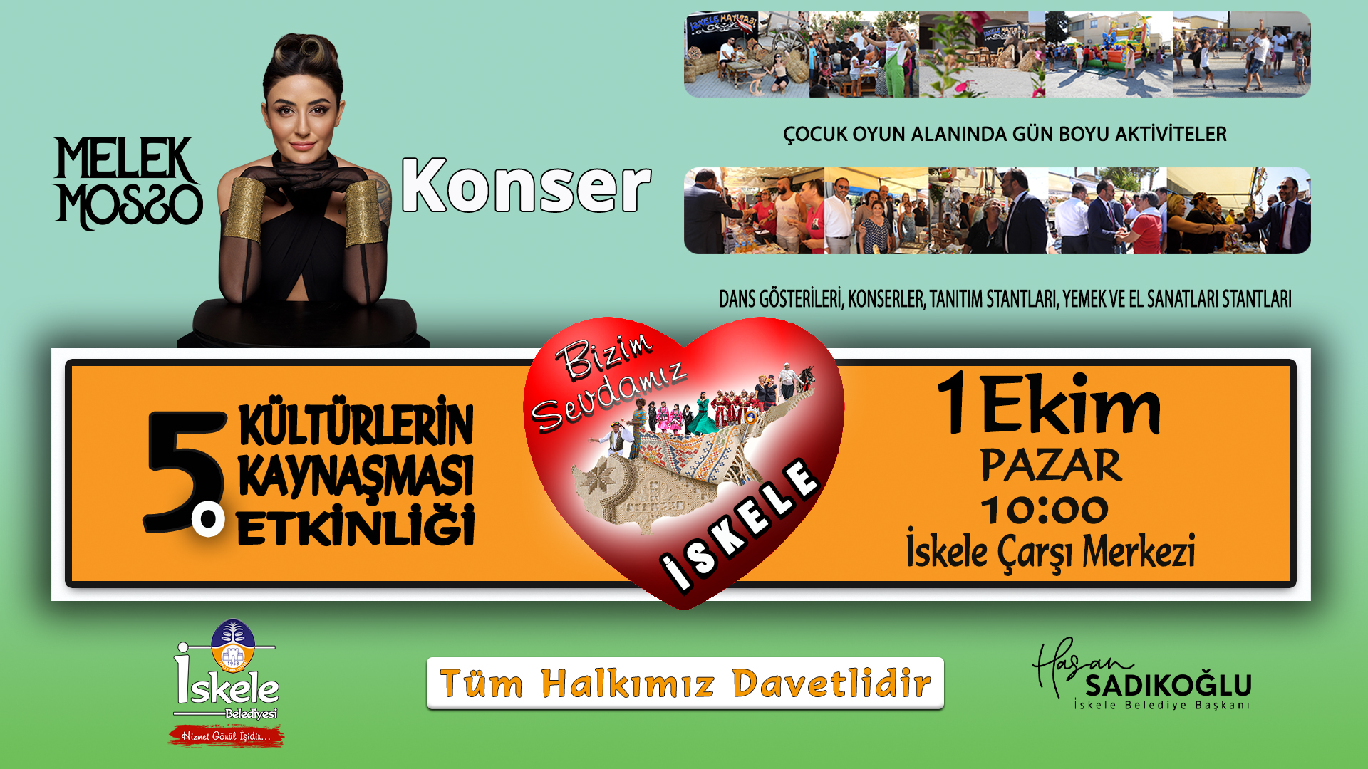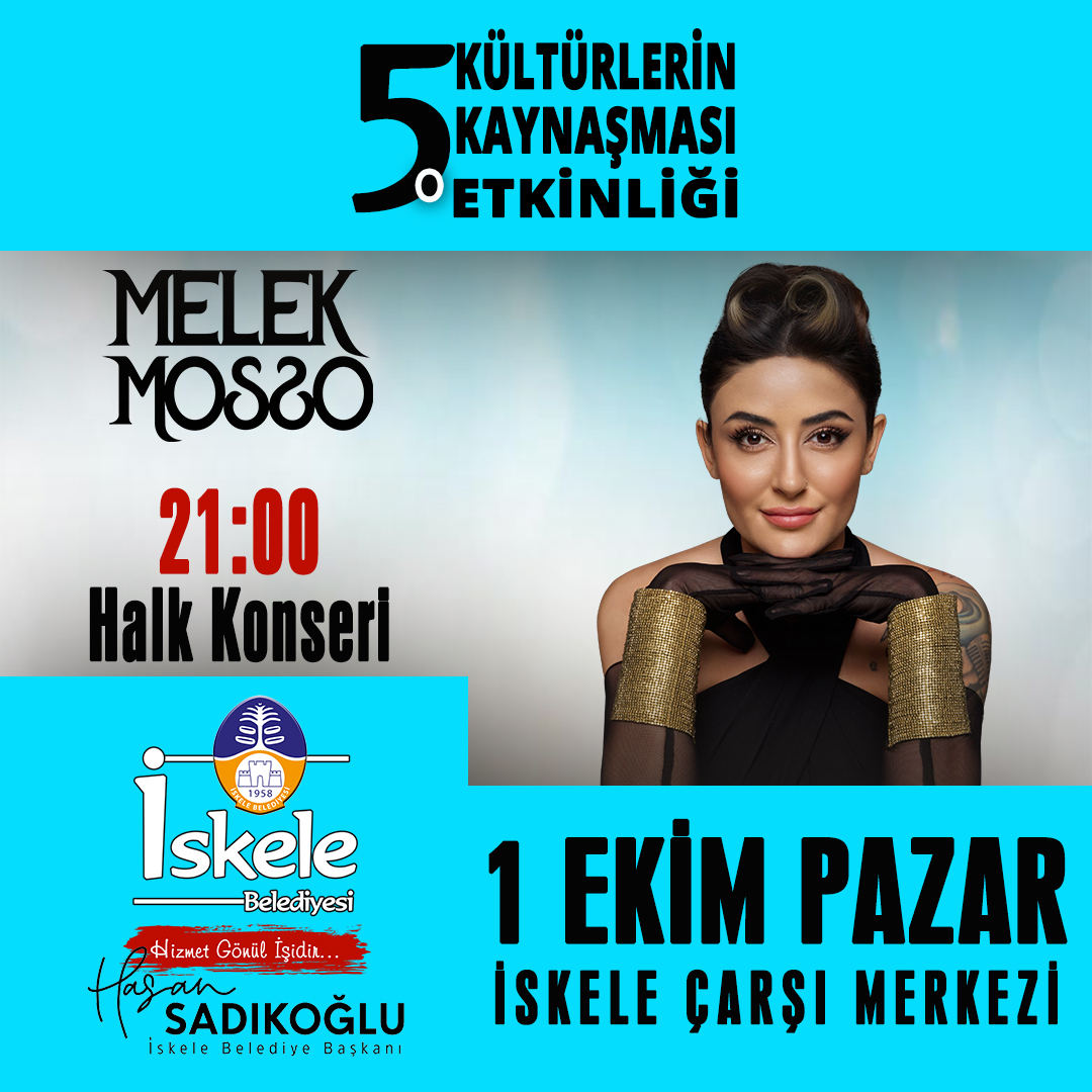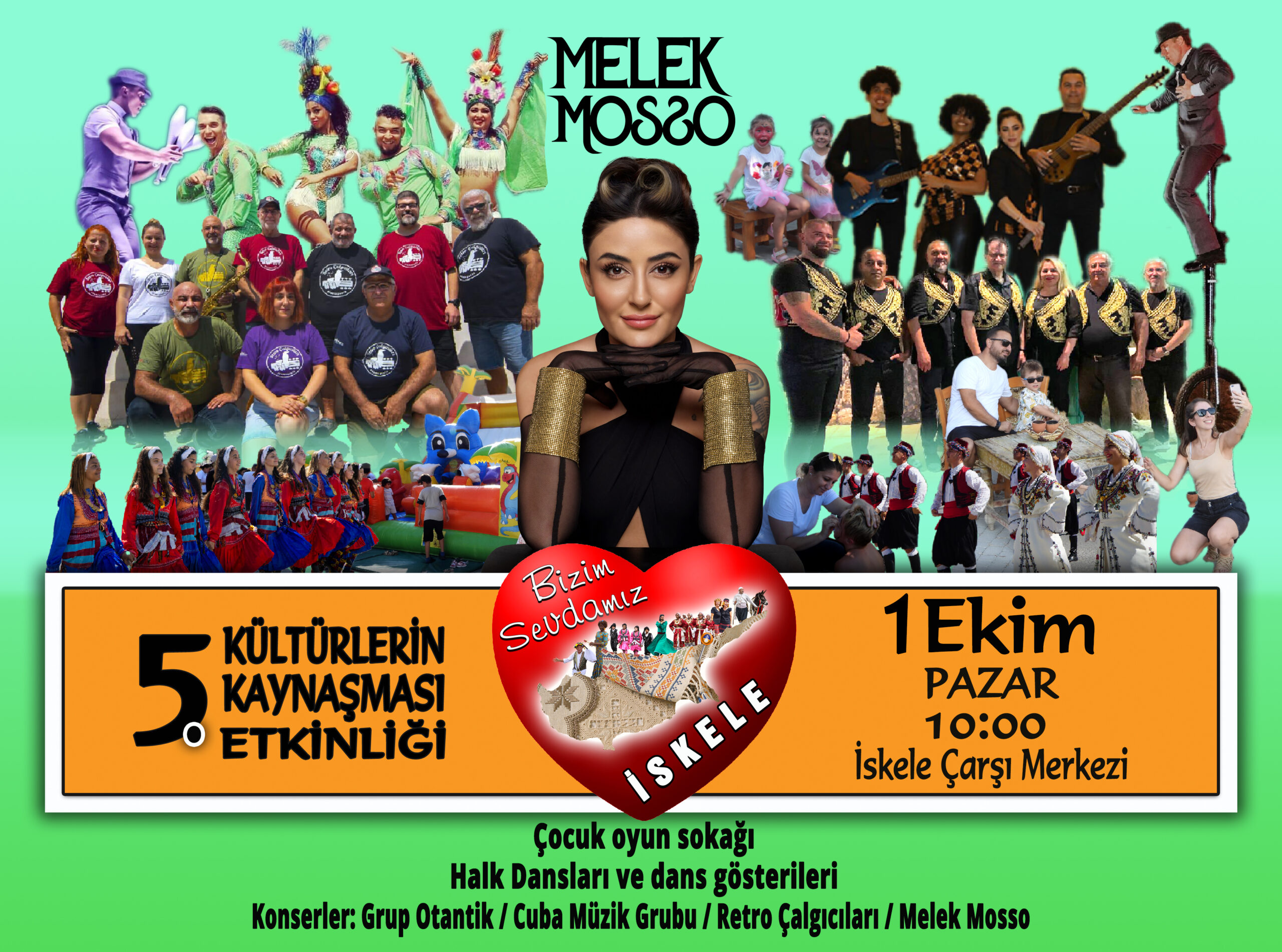 İskele Belediyesi 5. Kültürlerin Kaynaşması Etkinliğinde konserler de olacak. Yerli sanatçılarımız Grup OTANTİK ve Retro Çalgıcılarının yanı sıra Cuba Music Group ve İran Müzik Grubu’ da konser vereceği etkinliğin final konserinde ise sahneye, şarkıcı Melek Mosso çıkacak. Kuzey Kıbrıs Türk Cumhuriyeti’nde vereceği ilk halk konserinde dinleyicileri ile buluşacak Mosso, saat 21.00’da İskele Çarşı Merkezi’ne kurulacak sahnede sevilen şarkılarını seslendirecek.