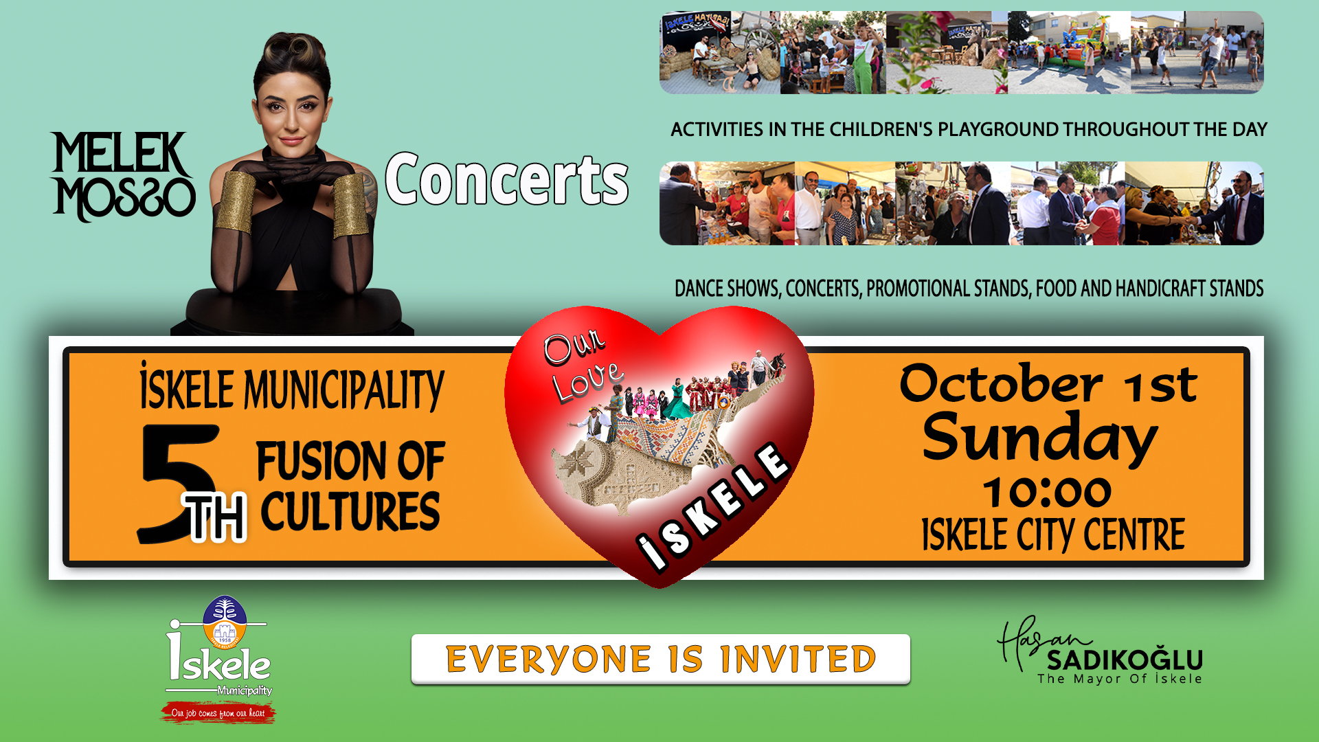 1 Ekim Pazar günü saat 10.00’da başlayıp gün boyu devam edecek etkinlik yine çok ses getirecek. Yaklaşık 150 stantın kurulacağı, birçok kültürün buluşmasına ev sahipliği yapacağı 5. Kültürlerin Kaynaşması Etkinliğinin finalinde ise şarkıcı Melek Mosso sahne alacak. İskele Şehir Merkezinden itibaren bazı sokakların da araç trafiğine kapanacağı etkinlikte konserler, dans gösterileri, Anavatan Türkiye’den gelerek Kıbrıs’ı yurt bilenlerin, İskele Belediyesi’nin kardeş şehirleri ve 3. Ülke vatandaşlarının kültürlerini yansıtan, yiyecek, içecek, el emeği göz nuru eserlerin yer alacağı stantlar kurulacak, İskele, deyim yerindeyse bir kez daha buram buram kültür kokacak.