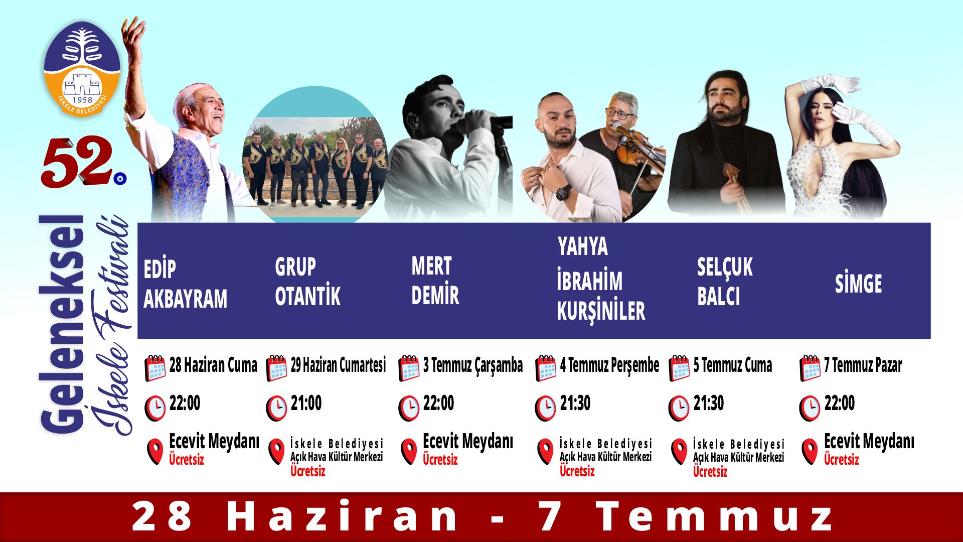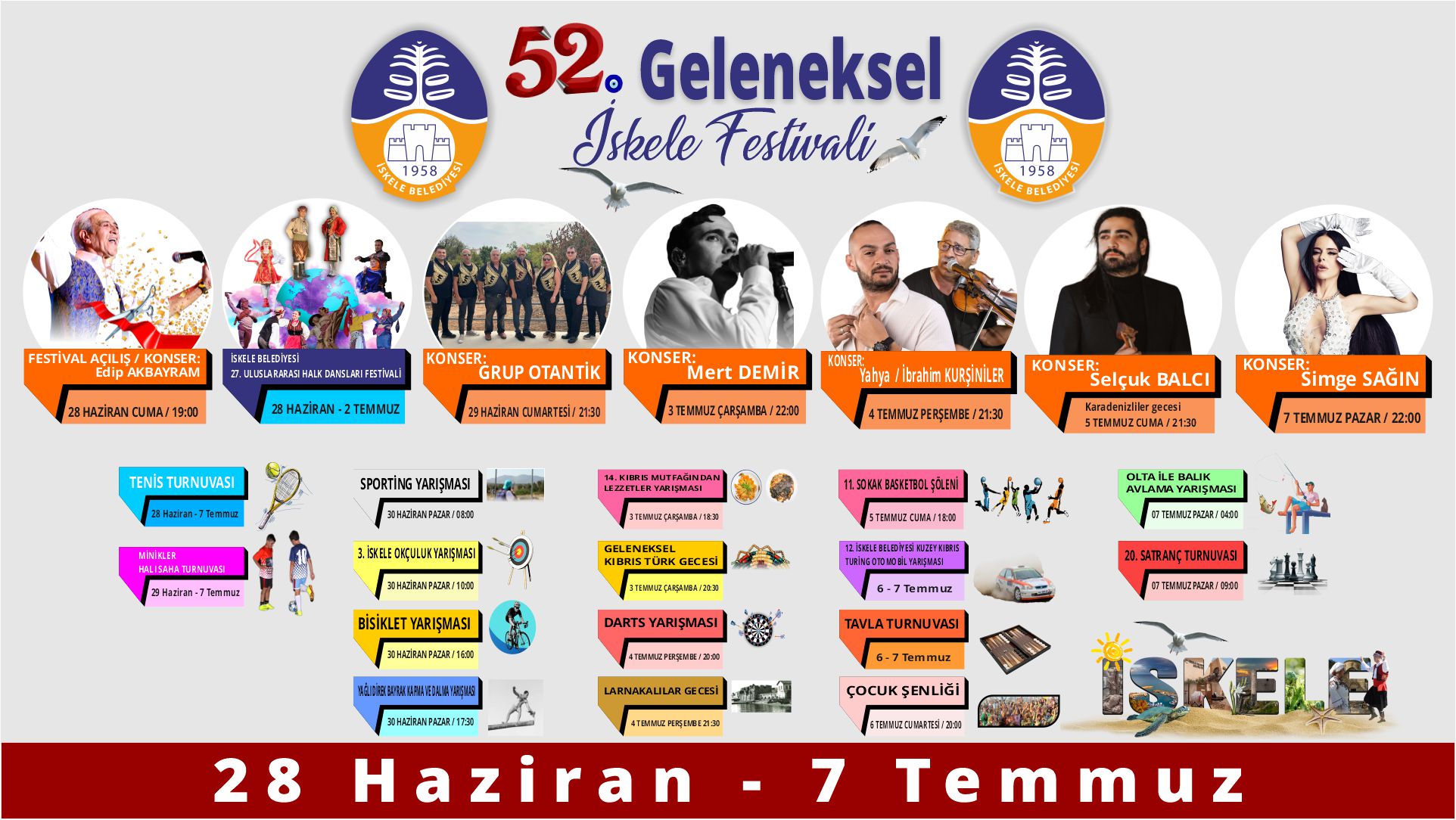 28 Haziran-7 Temmuz tarihleri arasında gerçekleşecek İskele Festivali’nin açılış konserini duayen sanatçı Edip Akbayram verecek. 7 Temmuz Pazar gününe kadar sürecek festivalde, 29 Haziran Cumartesi günü Grup Otantik, 3 Temmuz Çarşamba günü Mert Demir, 4 Temmuz Perşembe günü Yahya ve İbrahim Kurşiniler, 5 Temmuz Cuma günü Selçuk Balcı ve 7 Temmuz Pazar günü Simge Sağın da konser verecek. Tüm konserlere giriş ücretsiz olacak
