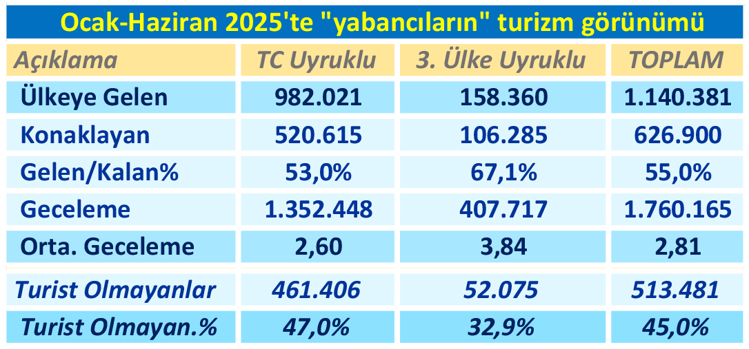 İlk 6 ayda, “Kendi alternatifleri ve statüleri kapsamında” ülkede konaklayan kişi sayısı 513 bin 480 kişi düzeyinde saptandı. Bunların 461 bin 406’sını (%89.86) Türkiye Cumhuriyeti uyruklular; 52 bin 075’ini (%10.14) da “Diğer ülkelerden” gelenler oluşturdu. TC uyruklu ziyaretçilerin %47’sinin, diğer yabancıların ise %33’ünün ülkeye turizm amacıyla gelmediği hesaplandı. Bu arada, uzman turizmciler gelenlerin ciddi bir kısmının, “kısa vadeli apartman dairesi, ev, villa kiralamaları veya airbnb modeli” çerçevesinde tatil yaparak, istatistiklerin dışına çıktığını özellikle belirtiyor.