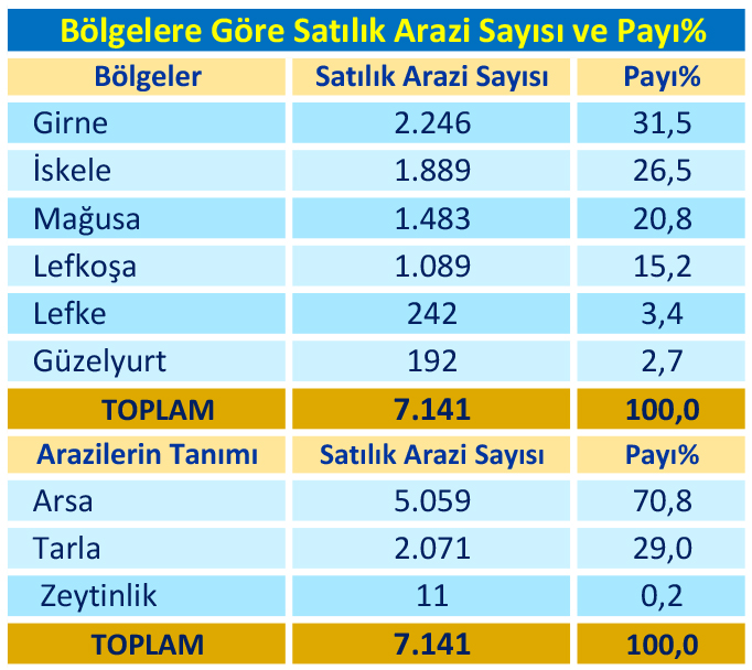 Emlak başkenti Girne ve bölgesi, satılık arsa ve tarla sayısında da önde. Veriler, Girne’de 2 bin 246 (%31.5) adet satılık arazi ve tarla olduğunu gösteriyor. Girne’nin ardından bin 889 adet (%26.5) satılıkla İskele bölgesi geliyor. Mağusa bölgesi bin 483 adet satılık arazi ve %20.8 payla üçüncü, Lefkoşa bölgesi de bin 089 adet arazi ve %15.2 payla dördüncü sırada yer aldı. Verilere göre, Lefke’de 242; Güzelyurt’ta da 192 satılık arazi var.