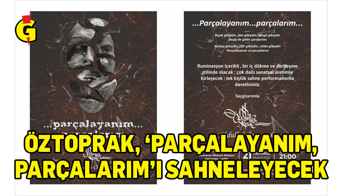 Abdullah Öztoprak, kendi yazmış olduğu tek kişilik oyunu "Parçalayanım, Parçalarım"ı pazar günü Gaziveren'de sahneleyecek.