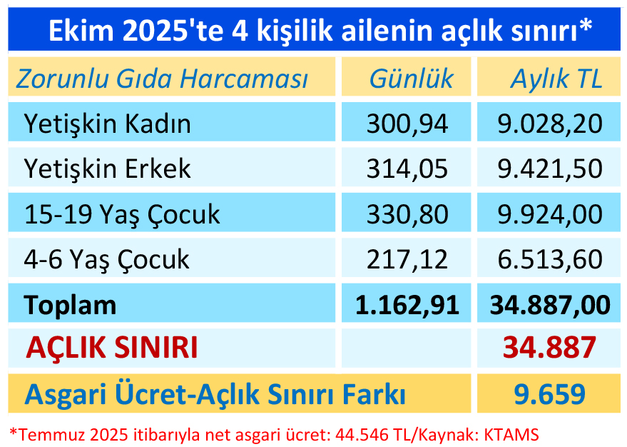Veriler dört kişilik bir aile sadece sağlıklı beslenebilmek için günde en az bin 162 (1,1612) lira harcama yapmak zorunda kaldığını gösteriyor. KTAMS’ın hesaplamasına göre yetişkin bir kadının yapması gereken zorunlu gıda harcama tutarı günlük 301 TL (aylık 9 bin 028); yetişkin bir erkek için günlük 314 TL (aylık 9 bin 421); 15-19 yaş çocuk için günlük 331 TL (aylık 9 bin 924); 4-6 yaş çocuk için günlük 217 TL (aylık 6 bin 513) oldu.