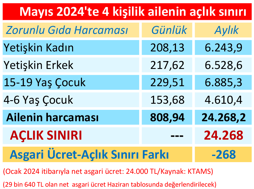 KTAMS’ın Sağlık Bakanlığı Yataklı Tedavi Kurumları Dairesi ile İstatistik Kurumu verilerini kullanarak yaptığı hesaplama, dört kişilik bir aile sadece sağlıklı beslenebilmek için günde en az 809 TL harcama yapmak zorunda kaldığını gösteriyor. Sendikanın hesaplamasına göre yetişkin bir kadının yapması gereken zorunlu gıda harcama tutarı günlük 208, aylık 6 bin 244 TL; yetişkin bir erkek için günlük 218, aylık 6 bin 529 TL; 15-19 yaş çocuk için günlük 229 TL, aylık 6 bin 885 TL; 4-6 yaş çocuk için günlük 154 TL, aylık 4 bin 610 TL oldu.