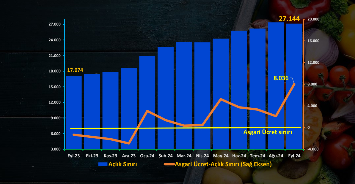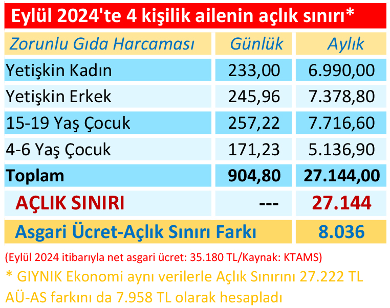 KTAMS’ın hesaplamasına göre, 4 kişilik bir aile sadece sağlıklı beslenebilmek için günde en az 904 TL 80 kuruş harcama yapmak zorunda. Açıklamada, sendikanın yapmış olduğu çalışmaya göre sağlıklı beslenmek için yetişkin bir kadının yapması gereken zorunlu gıda harcamasının tutarı günlük 233,  aylık 6 bin 990 TL; yetişkin bir erkeğin günlük 245.96, aylık 7 bin 378.8 TL; 15-19 yaş çocuğun günlük 257.22, aylık 7 bin 716.6 TL ve 4-6 yaş çocuğun günlük 171.23 TL, aylık 5 bin 136.9 TL olduğu kaydedildi. Asgari ücret dünkü kurdan 780 sterline, açlık sınırı ise 602 sterline karşılık geliyor. Açıklamada ayrıca, ülkede Eylül 2024 itibarıyla %2.53 oranında enflasyon olduğu da bildirildi.