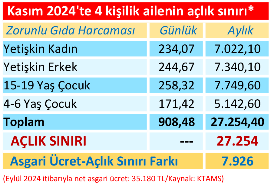 KTAMS’ın hesaplamasına göre 4 kişilik bir aile sadece sağlıklı beslenebilmek için günde en az 908 TL 48 kuruş harcama yapmak zorunda. Sendikadan yapılan yazılı açıklamaya göre sağlıklı beslenmek için yetişkin bir kadının yapması gereken zorunlu gıda harcama tutarı günlük 234.07 TL (aylık 7 bin 022.10 TL); yetişkin bir erkek için günlük 244.67 TL (aylık 7 bin 340.10 TL); 15-19 yaş çocuk için günlük 258.32 TL (aylık 7 bin 749.60 TL); 4-6 yaş çocuk için günlük 171.42 TL(aylık 5 bin 142.60 TL) olarak hesaplandı.