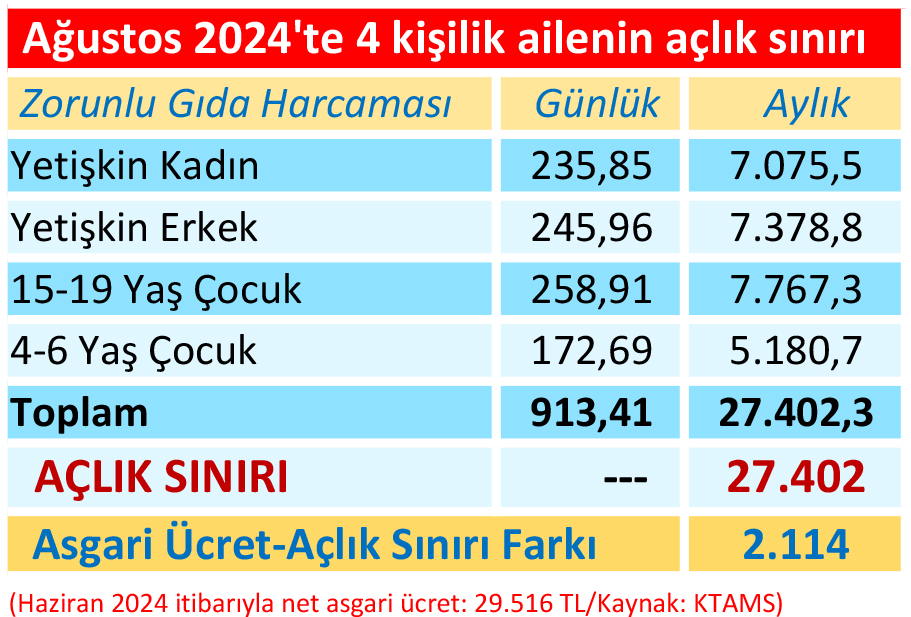 KKTC’de 31 Ağustos 2024 itibarıyla dört kişilik bir ailenin zorunlu gıda harcamalarını içeren “açlık sınırı” aylık 27 bin 402 TL’ye ulaştı. Bu yılın Ocak ayında 20 bin 933 TL olarak hesaplanan açlık sınırı 2024 yılın sekiz aylık döneminde %31 oranında artarken, Ağustos 2023-Ağustos 2024 arasındaki yıllık sürede ise %66 oranında yükseliş gösterdi. Geçen yılın sekizini ayı sonunda açlık sınırı 16 bin 526 TL düzeyinde kayıtlara geçmişti.