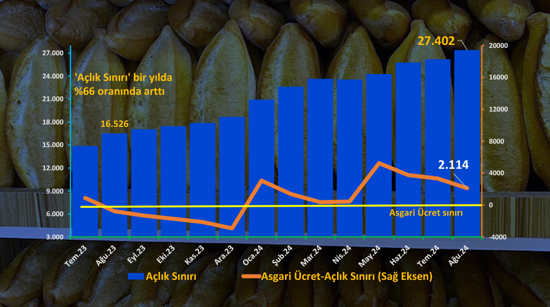 KKTC’de 31 Ağustos 2024 itibarıyla dört kişilik bir ailenin zorunlu gıda harcamalarını içeren “açlık sınırı” aylık 27 bin 402 TL’ye ulaştı. Bu yılın Ocak ayında 20 bin 933 TL olarak hesaplanan açlık sınırı 2024 yılın sekiz aylık döneminde %31 oranında artarken, Ağustos 2023-Ağustos 2024 arasındaki yıllık sürede ise %66 oranında yükseliş gösterdi. Geçen yılın sekizini ayı sonunda açlık sınırı 16 bin 526 TL düzeyinde kayıtlara geçmişti.