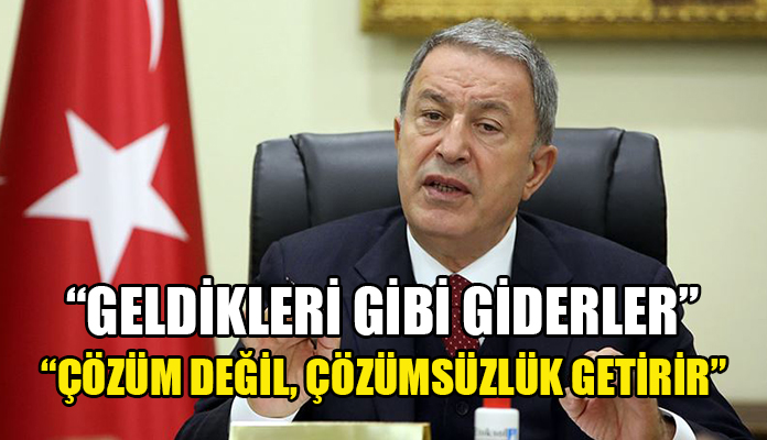 Akar, “Geldikleri gibi giderler” diyerek ABD’nin Güney Kıbrıs’a uyguladığı ambargoyu kaldırmasını sert bir dille eleştirerek “Siz eğer Güney Kıbrıs’ın ambargosunu kaldırırsanız, dengeleri bu şekilde bozmaya kalkarsanız bu barış değil çatışma, çözüm değil çözümsüzlük getirir” dedi.