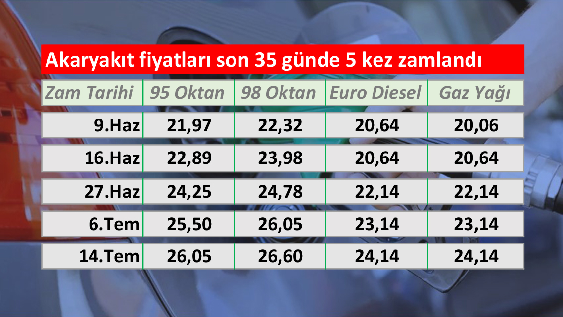 Akaryakıtta 9 Haziran’da ortalama %7,5 oranıyla başlayan zam sağanağı 16 Haziran’da, 27 Haziran’da, 6 Temmuz’da ve 14 Temmuz’da da devam etti. Zamlar sonrasında Haziran başında litresi 21,4 TL’den satılan 95 oktan benzin 26,05’e kadar çıkarken, 35 günlük sürede %18,57 oranında zamlandığı hesaplandı. Ortalama her “7” güne “1” zam sığdıran hükümet aynı dönemde 98 oktan bezinin litresine %19.18 oranında; Euro dizele %16.96 oranında; gaz yağına da %20.34 oranında zam yaptı.