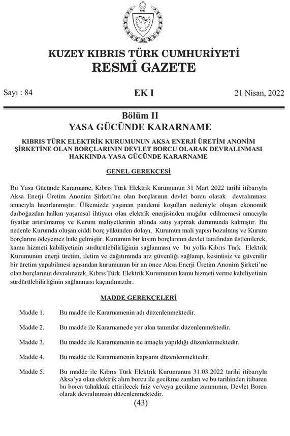 Kararnamede, ‘31 Mart itibariyle AKSA’ya olan elektrik alım borcu ile gecikme zamları ve bu tarihten itibaren bu borca tahakkuk ettirilecek faizleri ve/veya gecikme zamlarını devlet borcu olarak devralarak, ödenmesini amaçladığı’ belirtildi.