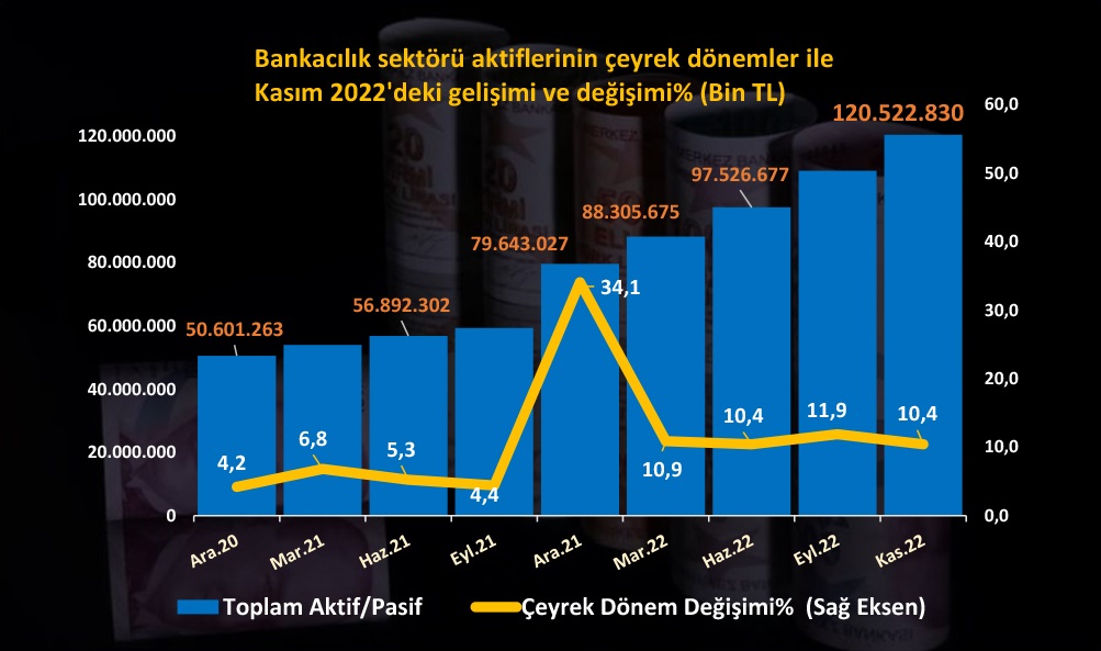 KKTC bankacılık sektörünün aktif büyüklüğü 120,5 milyar TL’nin üzerine çıktı. KKTC Merkez Bankası verilerine göre, yılın 11’nci ayı sonu itibarıyla sektörünün aktif büyüklüğü, Aralık 2021 sonuna göre %51.33 oranında artarak, 120 milyar 522 milyon TL’ye ulaştı. Aralık 2021 sonunda aktif büyüklük 79 milyar 643 milyon TL idi. 2022 yılının ilk çeyreği sonunda konsolide bilanço %10.88 artışla 88,3 milyar TL’ye, ikinci çeyrekte %10.4 artışla 97,5 milyar TL’ye, 3’ncü çeyrekte de %11.9 artışla 109,1 milyar TL düzeyinde kaydedilmişti. Son iki aylık artış oranı ise %10.4 düzeyinde hesaplandı.