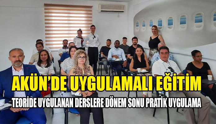 AKÜN kampusu içerisinde kabinin içi gibi dizayn edilen sınıfta yapılan uygulamalı derste, öğrenciler Ercan-Antalya seferini yapan uçak simülasyonunda yolculara servis yaptı.
