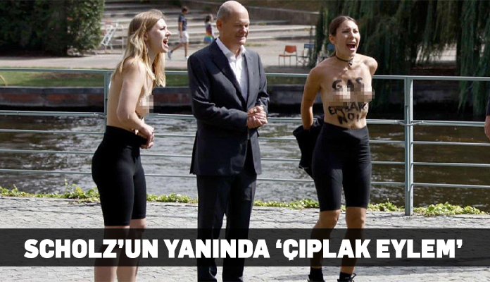 Fotoğraf çekimi sırasında ise dikkat çeken bir eylem yaşandı. İki kadın Scholz yanına gelerek, aniden üstlerini çıkardı.