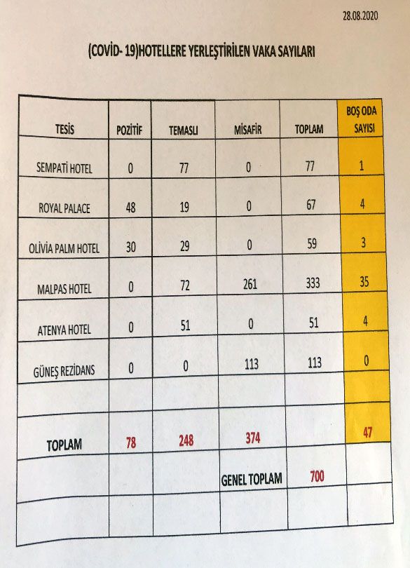 Maliye Bakanı Olgun Amcaoğlu, basına yaptığı yazılı açıklamada, salgının başladığı Mart ayından 27 Ağustos 2020’ye kadar yaklaşık 20 otel ve turistik tesiste 4 bin 600 kişinin karantinaya alındığını söyledi.