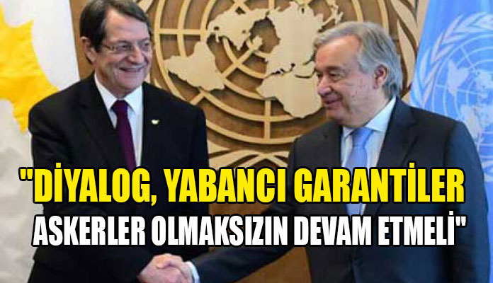 Güneydeki haber kaynaklarına göre, Kıbrıslı Rum lider Nikos Anastasiadis, görüşme sonrasında yaptığı açıklamada, Guterres’e, Türkiye’nin Cenevre’de ortaya koyduğu iki devlete dayalı çözüm koşullarından dolayı duyduğu hayal kırıklığını dile getirdiğini belirtti. BM Güvenlik Konseyi kararları temelindeki diyaloğa ilişkin siyasi iradesini yinelediğini söyleyen Anastasiadis, diyaloğun, yabancı garantiler ve askerler olmaksızın yaşayabilir ve işlevsel çözümü amaçlayacağını da belirtti. Anastasiadis açıklamasında ayrıca “Sayın Guterres, ortak niyetleri kesinleştirmek için Ersin Tatar ile ortak bir görüşme düzenlemesi gerektiğini düşünmesi halinde, kendisinin de dediği gibi, bunu yapması gerekir” ifadesini kullandı. Kaynak: Anastasiadis: “Diyalog, yabancı garantiler ve askerler olmaksızın devam etmeli”