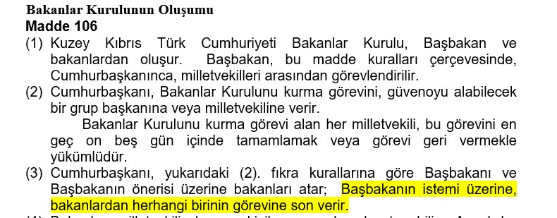 Anayasa’nın 106’ncı maddesinin 3’ncü fıkrasına göre, Cumhurbaşkanı’nın Başbakan’ın önerisi üzerine bakanları atadığı ve Başbakan’ın istemi üzerine bakanlardan herhangi birisinin görevine son verdiği ifadesi yer alıyor.