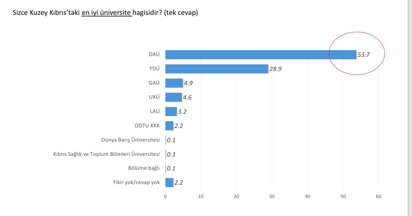 “Sizce Kuzey Kıbrıs’taki en iyi üniversite hangisidir?” sorusunu yanıtlayan kişilerin %53,7’si DAÜ derken, ikinci sıradaki YDÜ’nün oranı %28,9 olarak açıklandı. Diğer üniversitelerin hiçbiri %5’in üzerine çıkamadı.