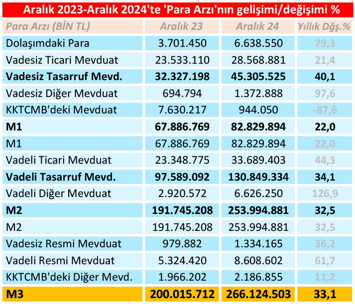 KKTC ekonomisinde kullanılabilecek toplam para miktarını gösteren ‘Para Arzı’ (M3), Aralık 2024’te 266 milyar 124 milyon 503 bin TL düzeyinde saptandı. KKTC Merkez Bankası verilerine göre yıllık bazda %33.05 oranında artan 2023 yılı sonunda 200 milyar 015 milyon TL idi. Aralık sonunda tüm zamanların zirvesini gören en geniş tanımlı olan M3, 12 ay boyunca artış gösterirken, birinci çeyrek sonunda 224,4 milyar liranın; ikinci çeyrekte 232,1 milyar liranın ve üçüncü çeyrekte de 248,8 milyar liranın üzerinde saptanmıştı.