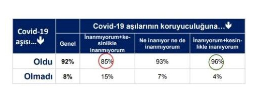 Kıbrıslı Türklerin yaklaşık %20’si Covid-19’u tehlikeli ve ölümcül bir hastalık olduğuna inanmıyor. Görüşmecilerin yüzde 92’si KKTC’de, Türkiye’de ya da bir başka ülkede en az 1 doz Koronavirüs aşısı olduğunu belirtti. Ancak, Koronavirüs aşılarının koruyuculuğuna inanmayanlar arasında aşı olanların oranı belirgin bir biçimde daha düşük.