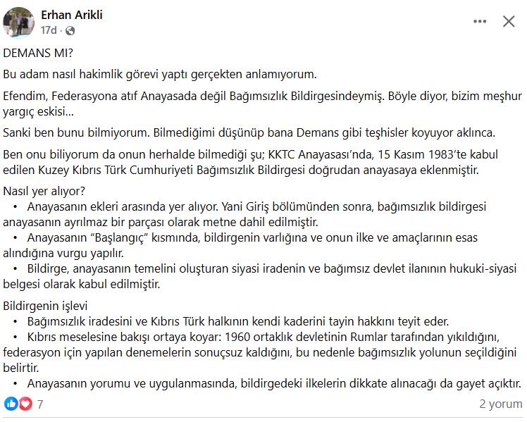 Eski yargıcın Anayasa ve Bağımsızlık Bildirgesi’ne ilişkin ifadelerine tepki gösteren Arıklı, “Bu adam nasıl hakimlik görevi yaptı gerçekten anlamıyorum” dedi.