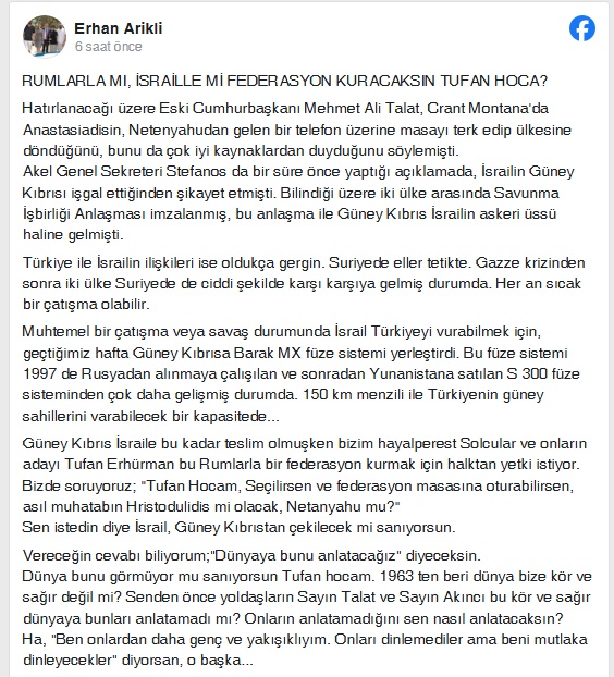 “Güney Kıbrıs İsrail’e bu kadar teslim olmuşken, bizim hayalperest solcular ve onların adayı Tufan Erhürman bu Rumlarla federasyon kurmak için halktan yetki istiyor. Sen istedin diye İsrail, Güney Kıbrıs’tan çekilecek mi sanıyorsun?”