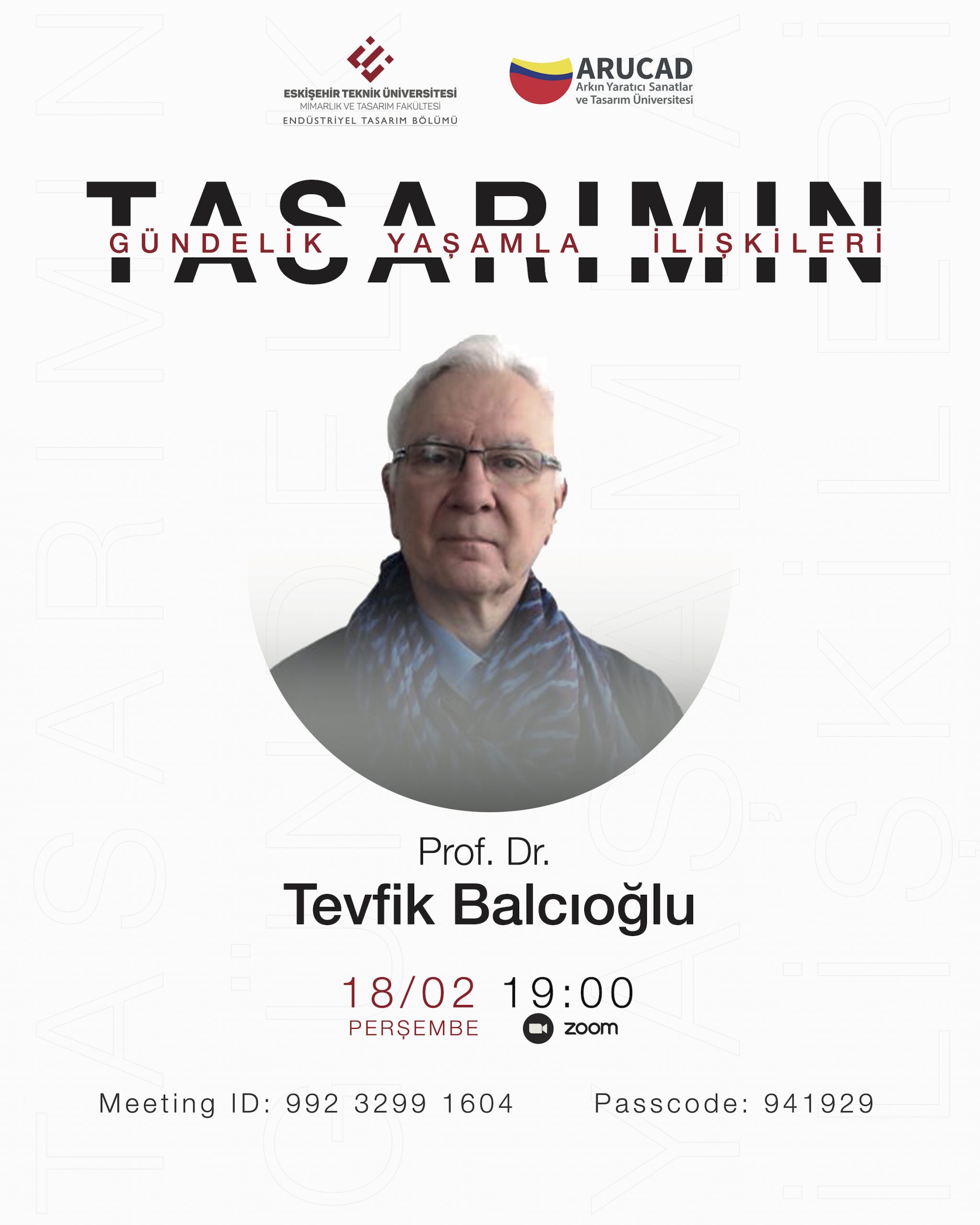 Eskişehir Teknik Üniversitesi Endüstriyel Tasarım Bölümü tarafından konferans vermeye davet edilen ARUCAD Mimarlık Bölümü Öğretim Üyesi Prof. Dr. Tevfik Balcıoğlu, ‘Tasarımın Gündelik Yaşamla İlişkileri’ üzerine 18 Şubat 2021’de saat 19.00’da herkese açık bir zoom konuşması gerçekleştirecektir.