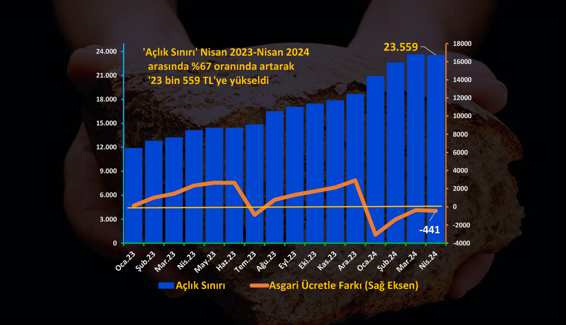 Açlık sınırının yıllık artış oranının (%66.52) İstatistik Kurumu’nun yıllık gıda enflasyonu (%66.36) ile aynı olduğu ve birbirini doğruladığı dikkati çekti. Bu veri, ülkede işçiyi ve dar gelirliyi rahatlatacak denilen 24 bin TL’lik net asgari ücret, açlık sınırına ancak üç ay dayanabildiğini gösteriyor. Özel sektör çalışanları, kamudan maaş çekenlerin Mayıs maaşlarına yapılacak %22.98’lik artışın, asgari ücrete de yapılmasını bekliyor.