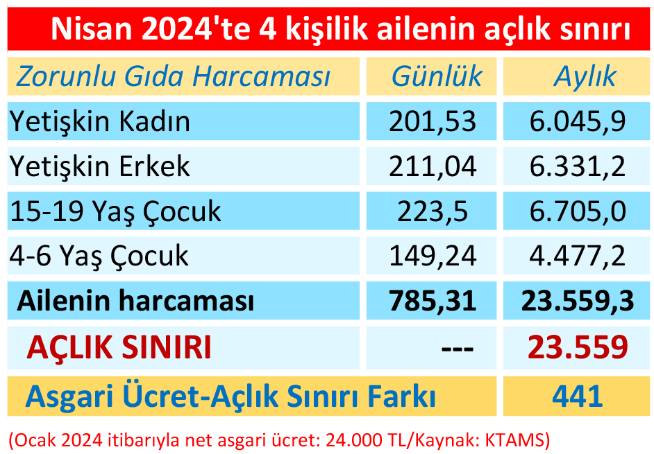 KTAMS’ın Sağlık Bakanlığı Yataklı Tedavi Kurumları Dairesi ile İstatistik Kurumu verilerini kullanarak yaptığı hesaplama, dört kişilik bir aile sadece sağlıklı beslenebilmek için günde en az 785 TL harcama yapmak zorunda kaldığını gösteriyor. Sendikanın hesaplamasına göre yetişkin bir kadının yapması gereken zorunlu gıda harcama tutarı günlük 202, aylık 6 bin 045 TL; yetişkin bir erkek için günlük 211, aylık 6 bin 331 TL; 15-19 yaş çocuk için günlük 224 TL, aylık 6 bin 705 TL; 4-6 yaş çocuk için günlük 149 TL, aylık 4 bin 477 TL oldu.