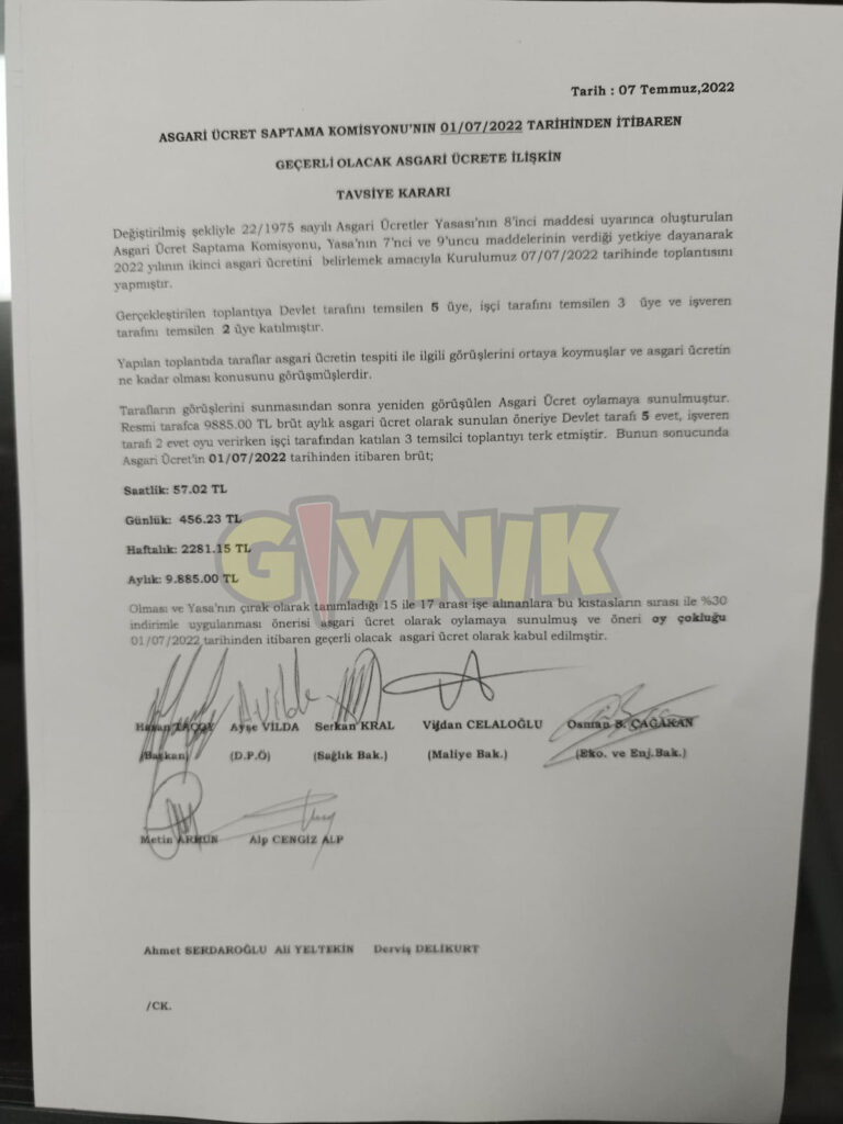 İşçi temsilcisinin masayı terk ettiği toplantının sonrasında açıklama yapan Çalışma ve Sosyal Güvenlik Bakanı Hasan Taçoy, işveren tarafı ve hükümetin onayı ile asgari ücretin brüt 9885 TL, net 8600 TL olarak belirlendiğini açıkladı.