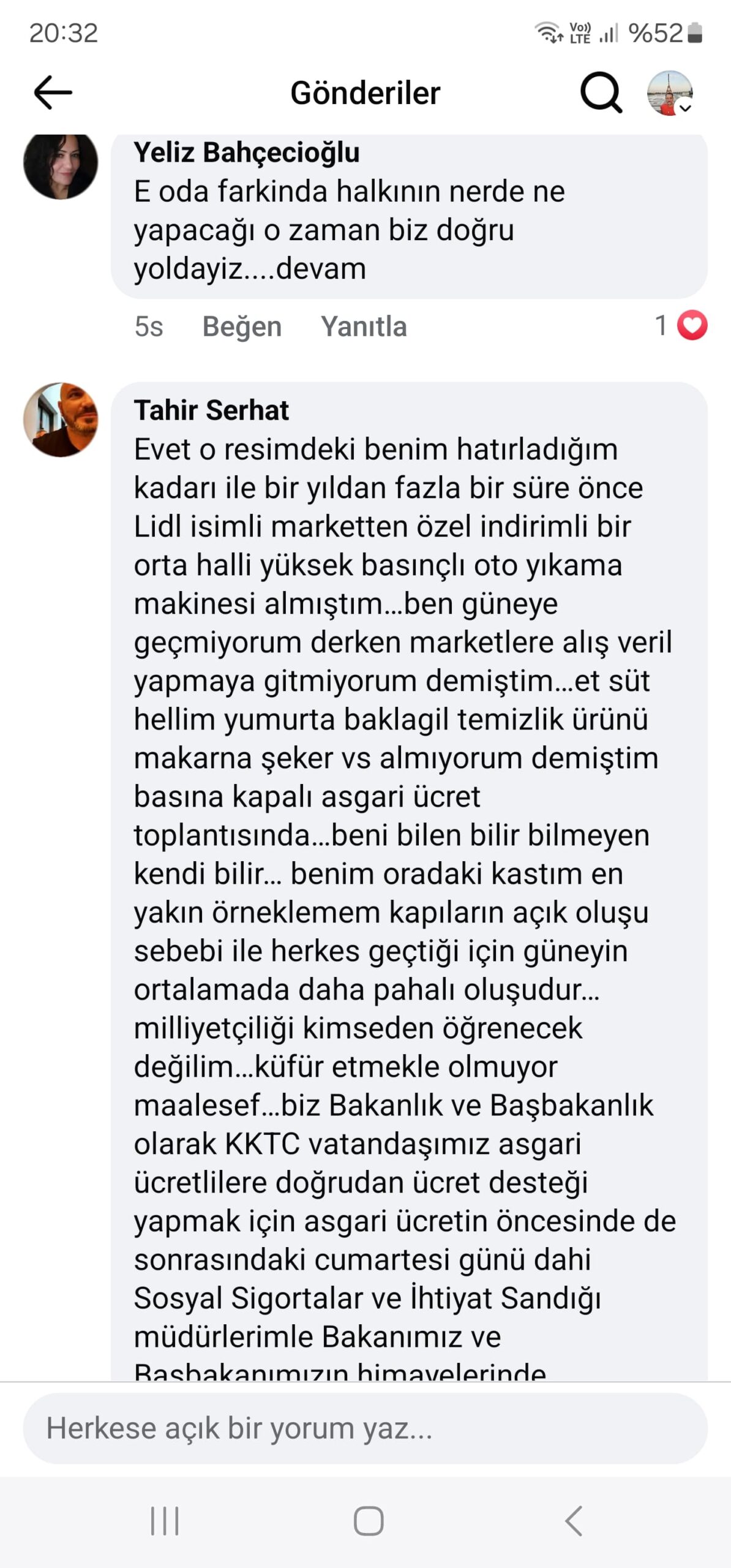 “Evet o resimdeki benim hatırladığım kadarı ile bir yıldan fazla bir süre önce Lidl isimli marketten özel indirimli bir orta halli yüksek basınçlı oto yıkama makinesi almıştım…ben güneye geçmiyorum derken marketlere alış veriş yapmaya gitmiyorum demiştim…et süt hellim yumurta baklagil temizlik ürünü makarna şeker vs almıyorum demiştim basına kapalı asgari ücret toplantısında…beni bilen bilir bilmeyen kendi bilir… benim oradaki kastım en yakın örneklemem kapıların açık oluşu sebebi ile herkes geçtiği için güneyin ortalamada daha pahalı oluşudur…milliyetçiliği kimseden öğrenecek değilim…küfür etmekle olmuyor maalesef…biz Bakanlık ve Başbakanlık olarak KKTC vatandaşımız asgari ücretlilere doğrudan ücret desteği yapmak için asgari ücretin öncesinde de sonrasındaki cumartesi günü dahi Sosyal Sigortalar ve İhtiyat Sandığı müdürlerimle Bakanımız ve Başbakanımızın himayelerinde çalışmaktayız…ve bunu en erken zamanda da başaracağız inşAllah…biz insanımızın enflasyon altında ezilmesini istemiyoruz tabii ki…ancak bunu hayat pahalılığını diğer Bakanlıklarımızla birlikte önlemek için ne gerekiyorsa yapacağız…herkes görüyor ki asgari ücret ne kadar artarsa artsın tüketim harcamaları bir o kadar daha artıyor maalesef…en büyük çabamız bu sarmalı önlemek…işverenlerimizin çalışanlarını işten durdurmamak şartı ile mayıs 2022 den beri prim desteği veriyoruz…aylık 33 milyon tl ile başladığımız prim desteği geçen ay itibarı ile 204 milyon 966 bin tl aylık tutara ulaşmıştır…bu rakamlar gerçek reel rakamlar olup arzu eden Bakanlığımızdan istediği bilgiyi alabilir…bu yazdıklarımı tamamen kendi hür irademle sizlerle paylaşıyorum… ilk ve son kez sosyal medyadan size sesleniyorum…